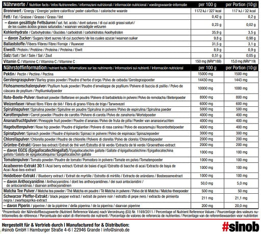 Sinob Greens & Reds 300g bietet eine umfassende Unterstützung für Ihre täglichen Nährstoffbedürfnisse. Mit sorgfältig ausgewählten Inhaltsstoffen fördert dieses Produkt Ihr allgemeines Wohlbefinden und Ihre Fitnessziele.